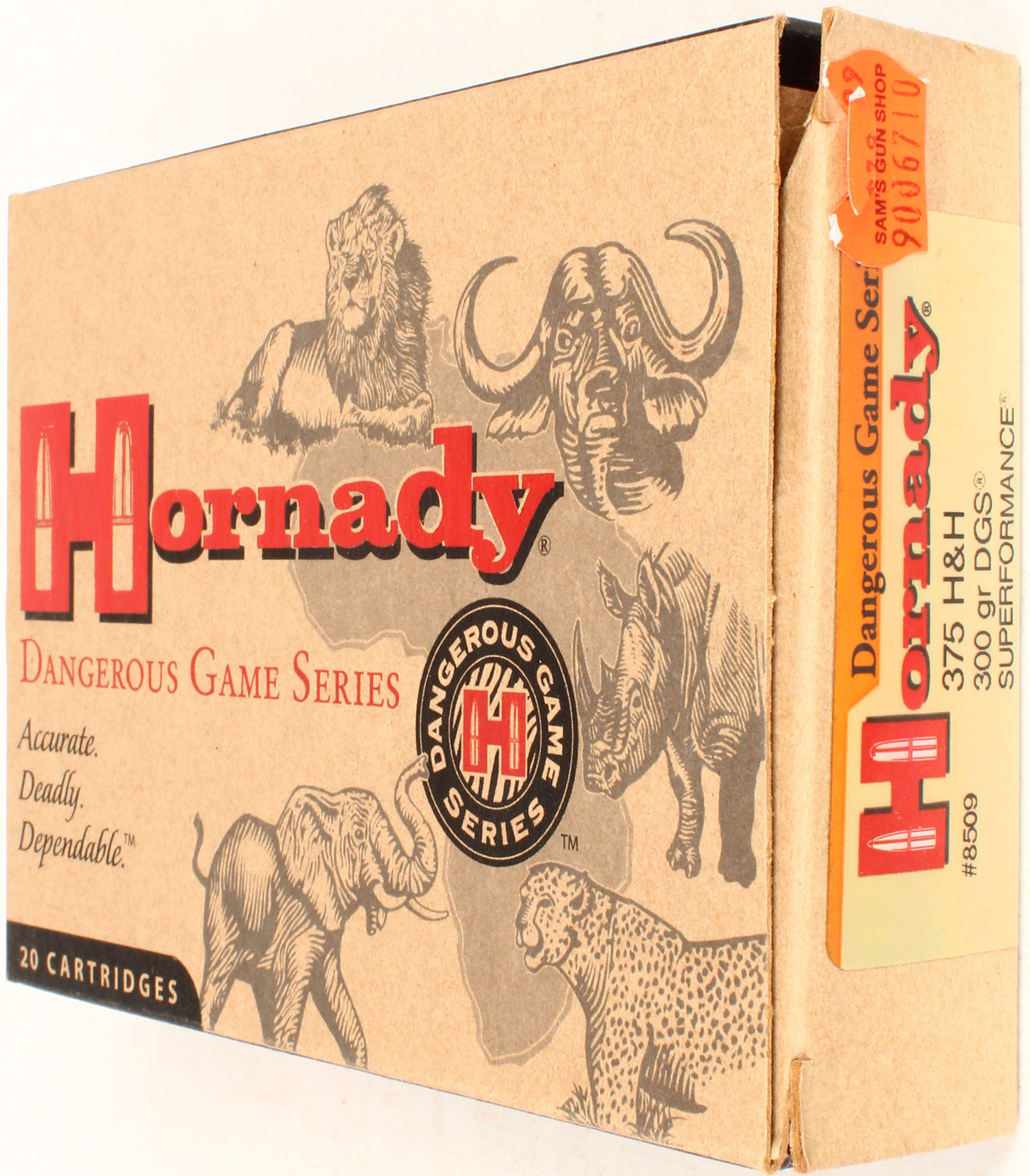 Hornady, Dangerous Game Series, 375 H&H, 300 Grain DGS, Full, 1pc. multi-colored box, box is solid with excellent color, Ammo is excellent. Grade: Excellent - Value: 20 to 60