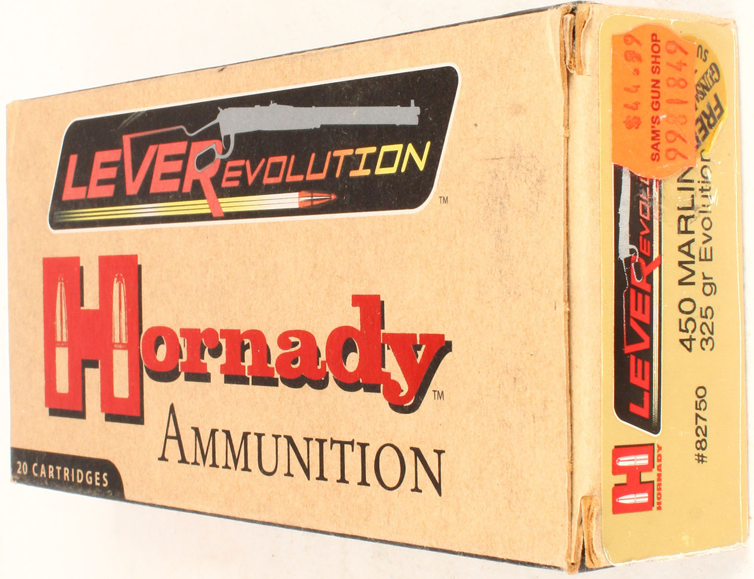Hornady, Lever Evolution, 450 Marlin, 325 Grain Evolution, Full, 1pc. multi-colored box, box is solid with excellent color, Ammo is excellent. Grade: Excellent - Value: 20 to 60