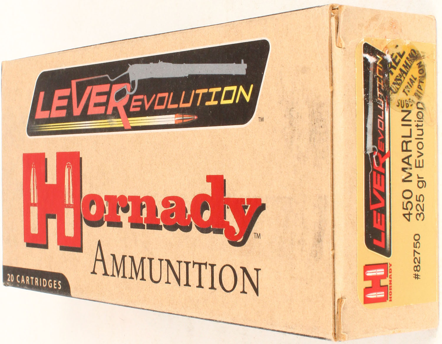 Hornady, Lever Evolution, 450 Marlin, 325 Grain Evolution, Full, 1pc. multi-colored box, box is solid with excellent color, Ammo is excellent. Grade: Excellent - Value: 20 to 60