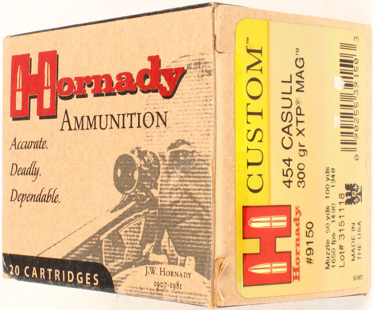 Hornady, CUSTOM, 454 Casull, 300 Grain XTP MAG, Full, 1pc. multi-colored box, box is solid with excellent color, Ammo is excellent. Grade: Excellent - Value: 20 to 60