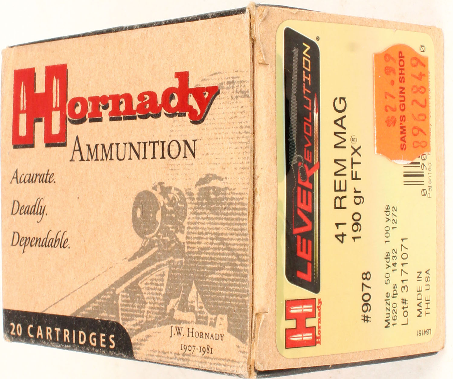 Hornady, Lever Evolution, 41 Rem Mag, 190 Grain FTX, Full, 1pc. multi-colored box, box is solid with excellent color, Ammo is excellent. Grade: Excellent - Value: 20 to 60