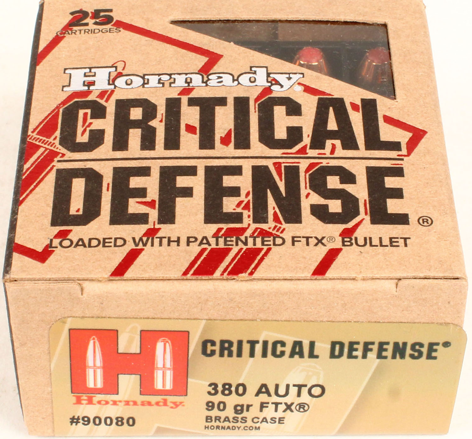 Hornady, Critical Defense, 380 Auto, 90 Grain FTX, Full, 1pc. multi-colored box, box is solid with excellent color, Ammo is excellent. Grade: Excellent - Value: 20 to 60