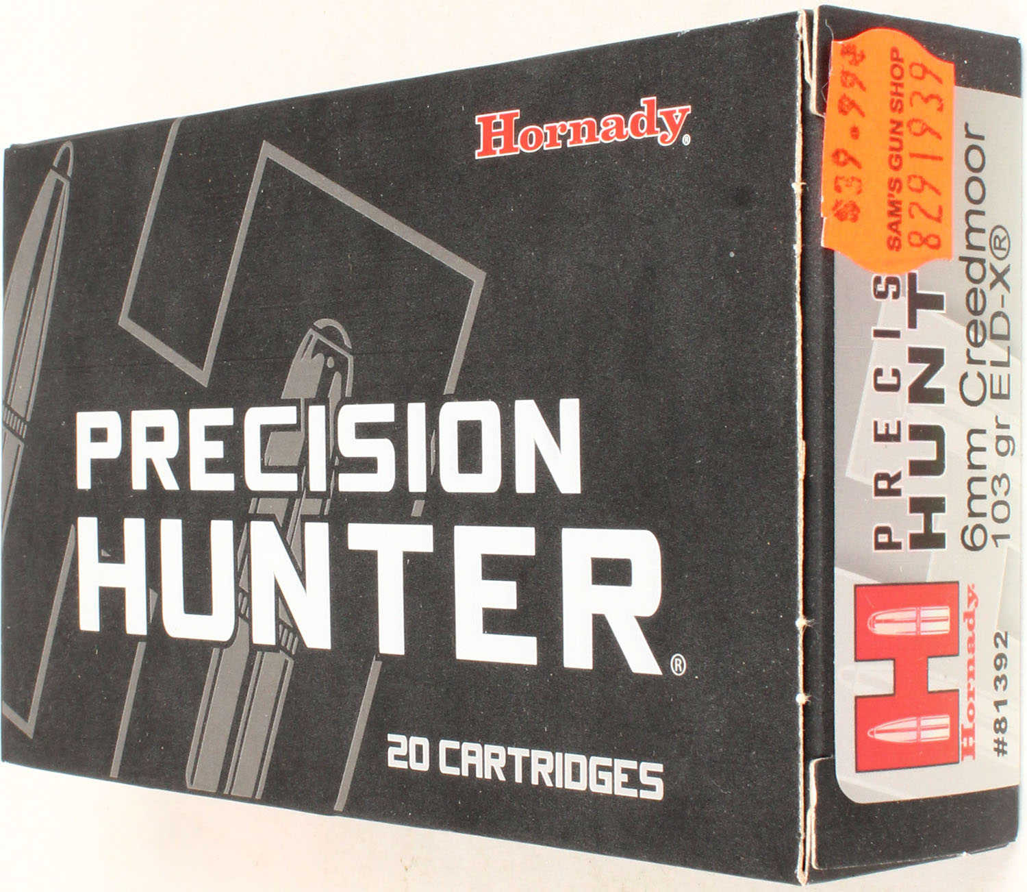Hornady, Precision Hunter, 6mm Creedmoor, 103 Grain ELD-X, Full, 1pc. multi-colored box, box is solid with excellent color, Ammo is excellent. Grade: Excellent - Value: 20 to 60