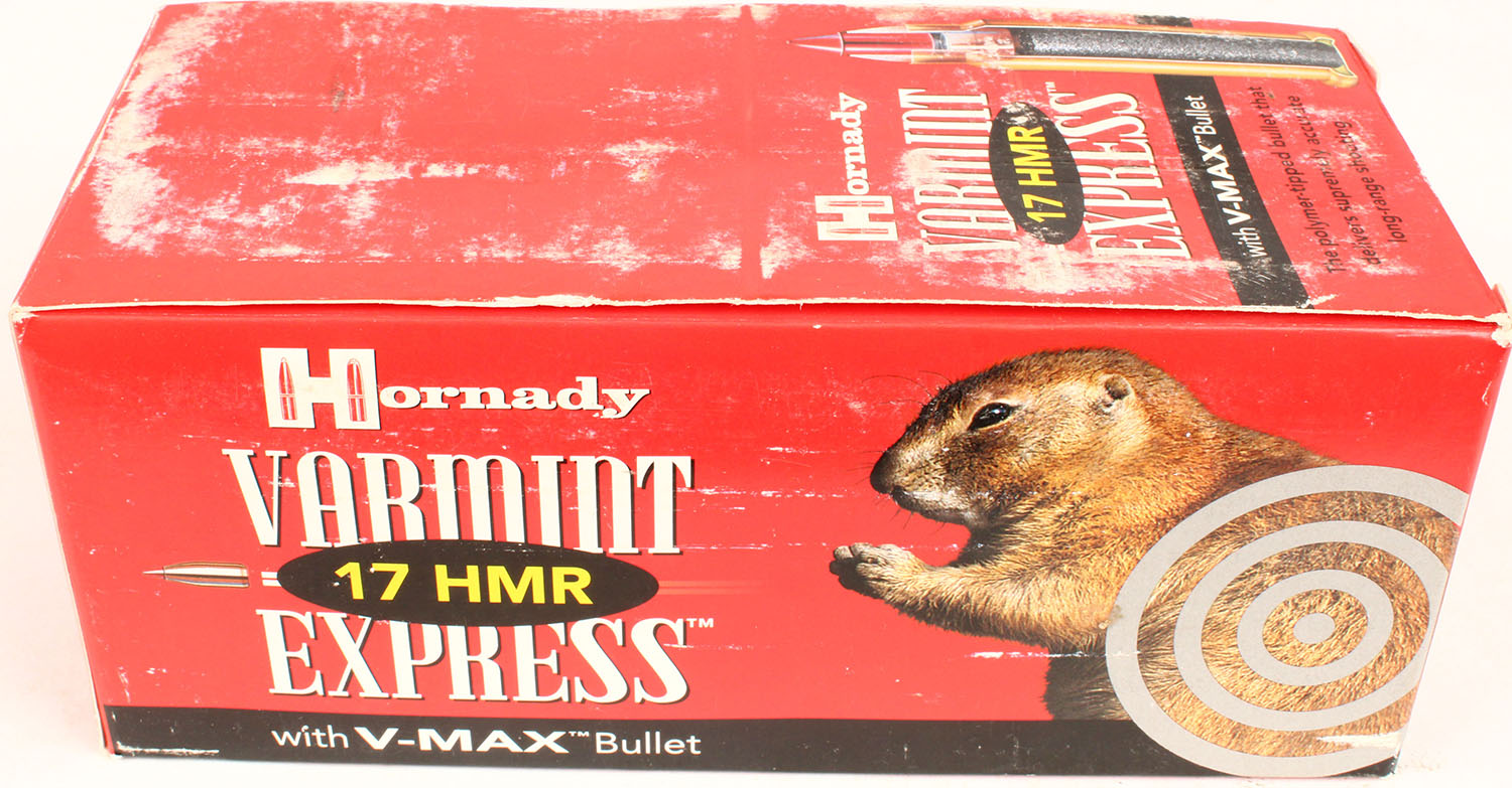 Hornady, 17 HMR, 17 Grain Varmint Express, Full brick of 10 boxes, 1pc. multi-colored box, box is solid with very nice color & shelf wear, Ammo is excellent. Grade: Excellent - Value: 40 to 120