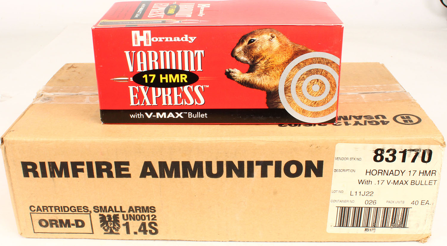 Case of Hornady, Varmint Express, 17 HMR, 17 Grain V-Max, Full, 40 Boxes, 2000rds., 1pc. multi-colored box, box is solid with excellent color, Ammo is excellent. Grade: Excellent - Value: 100 to 600