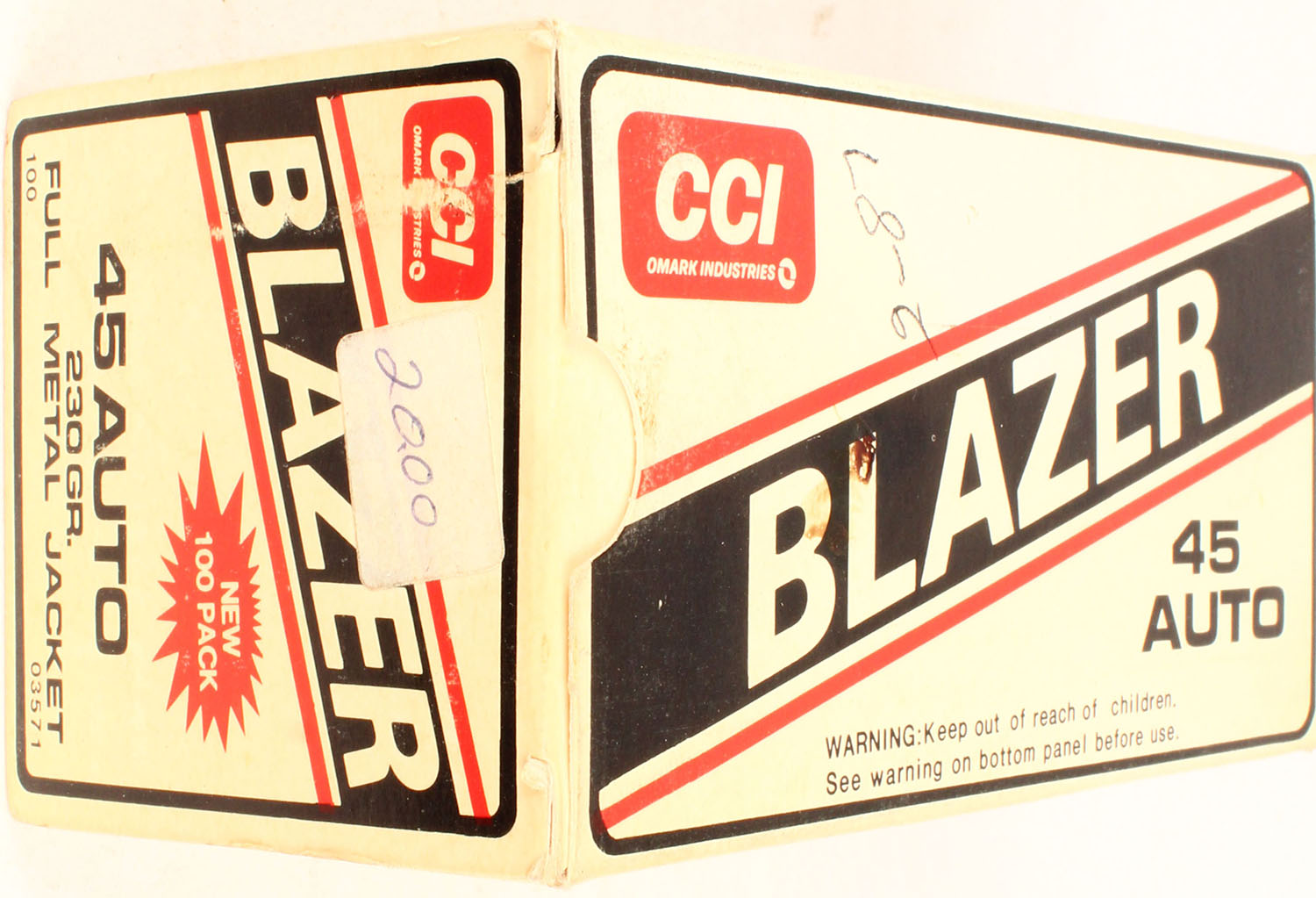 CCI, Blazer, 45 Auto, 230 Grain FMJ, Full, 1pc. multi-colored box, box is solid with excellent color & light shelf wear, Ammo is excellent. Grade: Excellent - Value: 20 to 60
