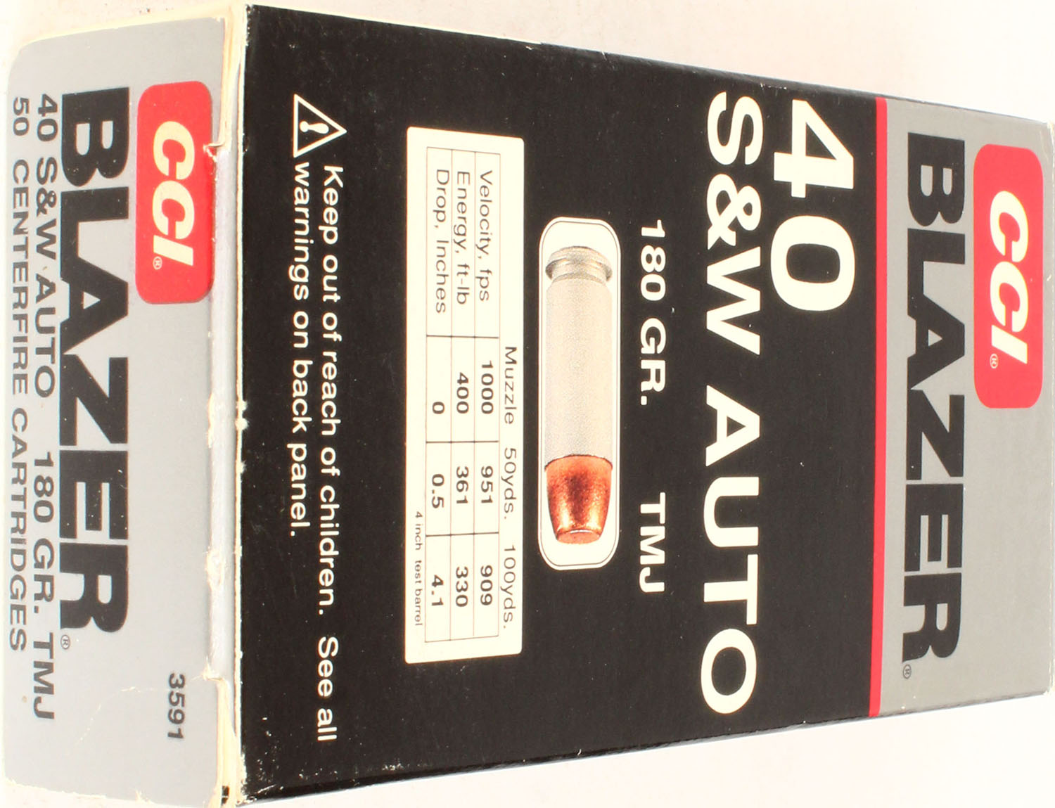 CCI, Blazer, 40 S&W Auto, 180 Grain TMJ, Full, 1pc. multi-colored box, box is solid with excellent color, Ammo is excellent. Grade: Excellent - Value: 20 to 60