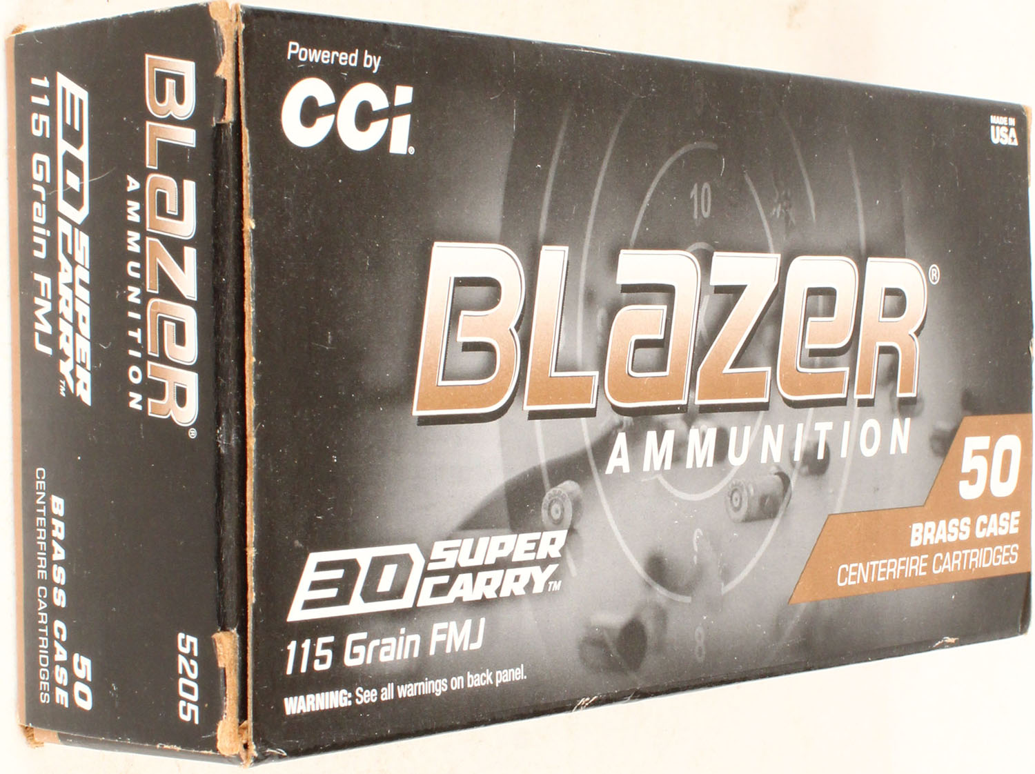 CCI, Blazer Brass, 30 Super Carry, 115 Grain FMJ, Full, 1pc. multi-colored box, box is solid with excellent color, Ammo is excellent. Grade: Excellent - Value: 20 to 60