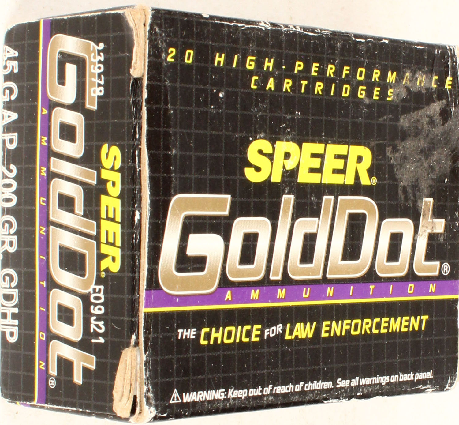Speer, GoldDot, 45 GAP, 200 Grain GDHP, Full, 1pc. multi-colored box, box is solid with excellent color, Ammo is excellent. Grade: Excellent - Value: 20 to 60