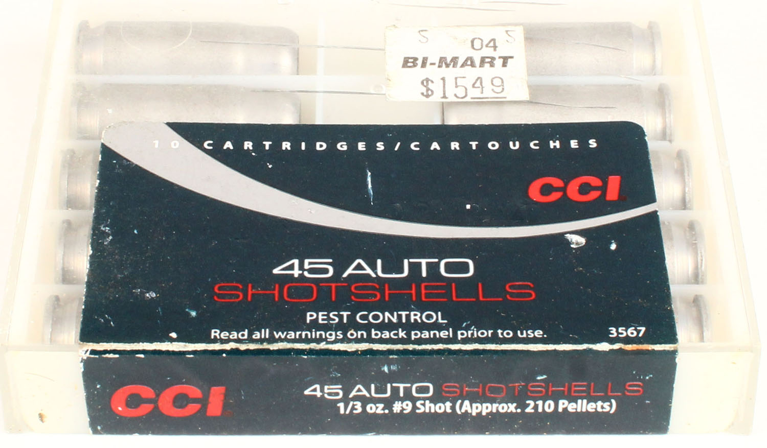 CCI, 45 auto, shotshells, Full, 1pc. multi-colored box, Ammo is excellent. Grade: Excellent - Value: 6 to 40