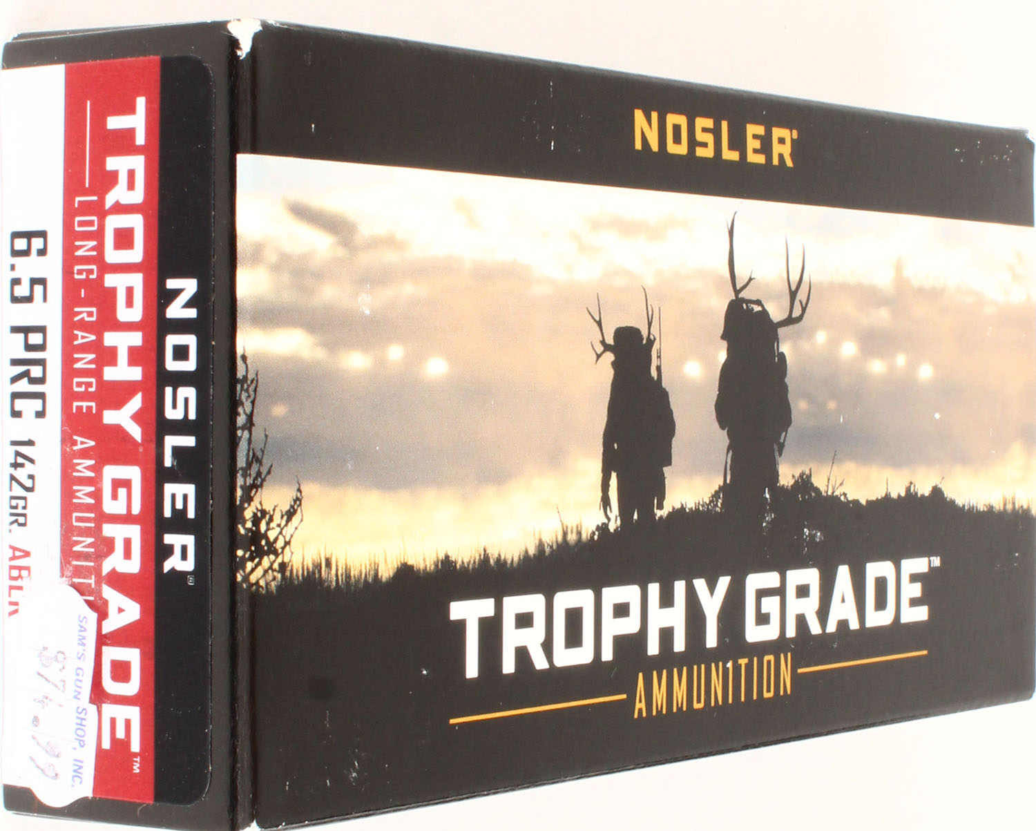 Nosler, Trophy Grade, 6.5 PRC, 142 Grain ABLR, Full, 1pc. multi-colored box, box is solid, with excellent color, Ammo is excellent. Grade: Excellent ++ - Value: 20 to 50