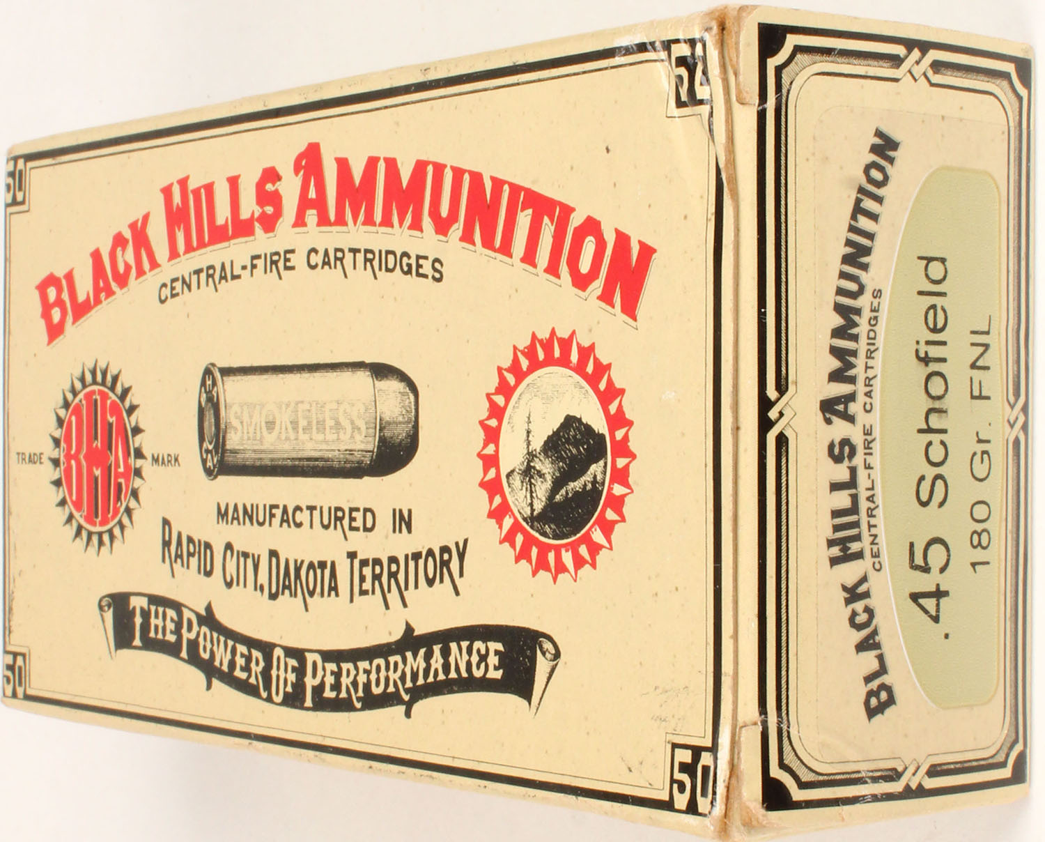 Black Hills Ammo., .45 Schofield, 180 Grain, Full, 1pc. multi-colored box, box is solid, with excellent color, Ammo is excellent. Grade: Excellent ++ - Value: 20 to 80