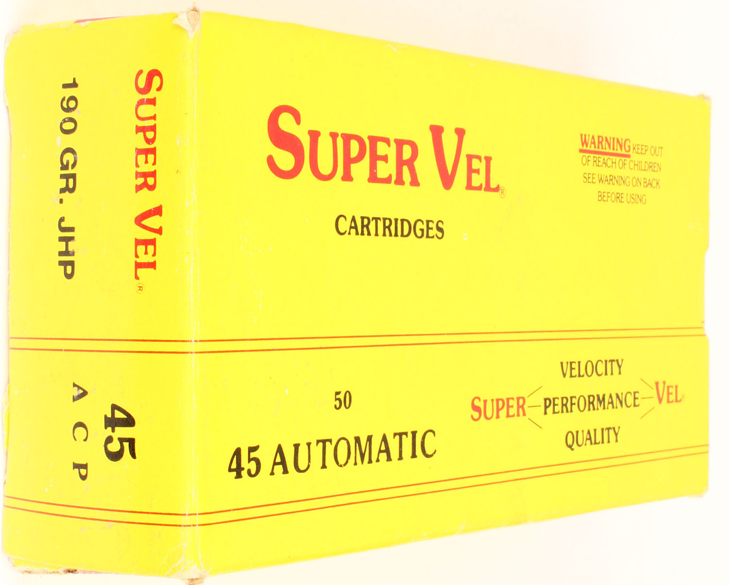 Super-Vel, .45 Auto, 190 Grain JHP, Full, 1pc. multi-colored box, box is solid, with excellent color, Ammo is excellent. Grade: Excellent ++ - Value: 20 to 80