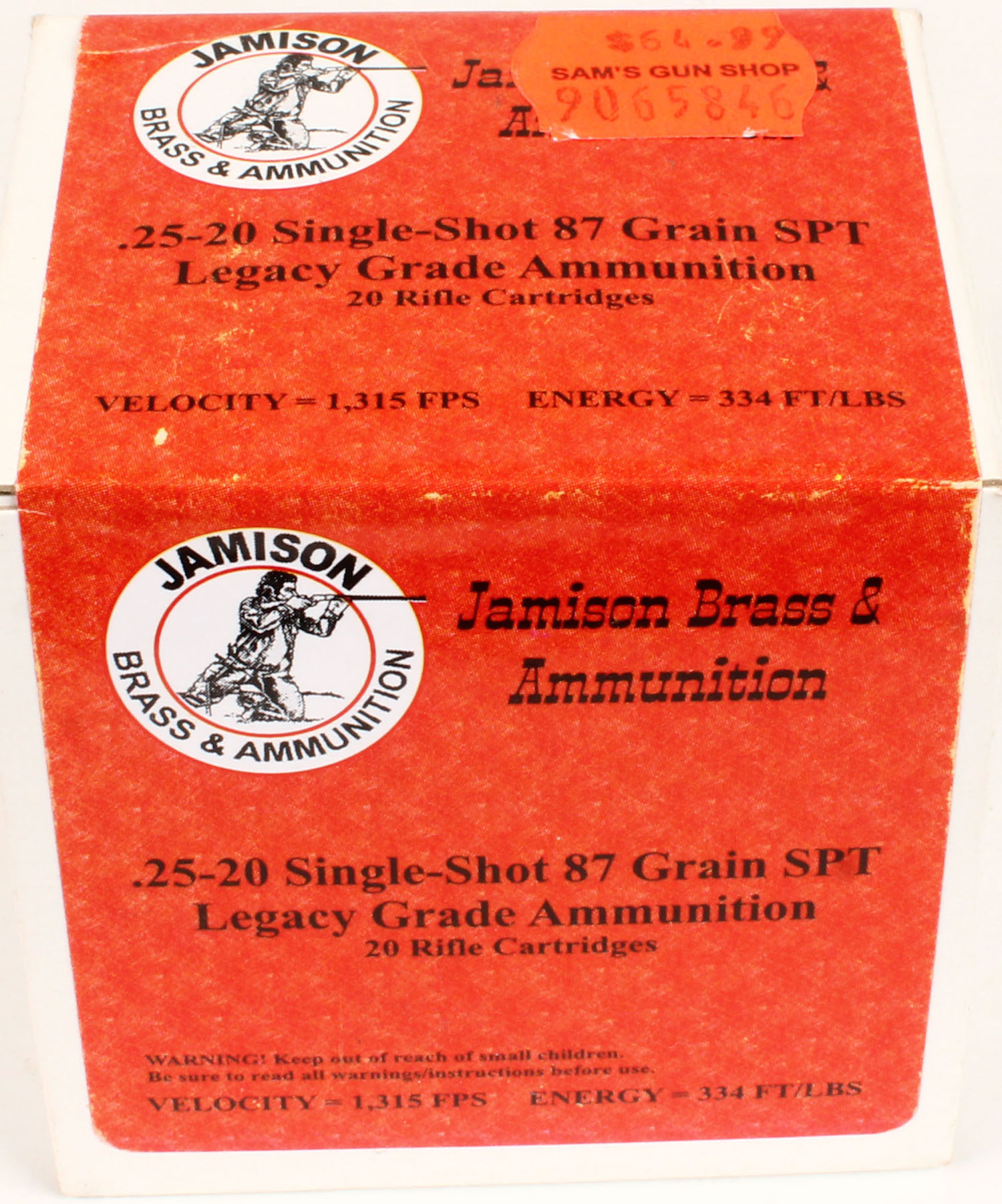 Jamison Brass & Ammunition, 25-20 Single Shot, 87 Grain SPT Legacy Grade, Full, 1pc. multi-colored box, box is solid, with excellent color, Ammo is excellent. Grade: Excellent ++ - Value: 60 to 150