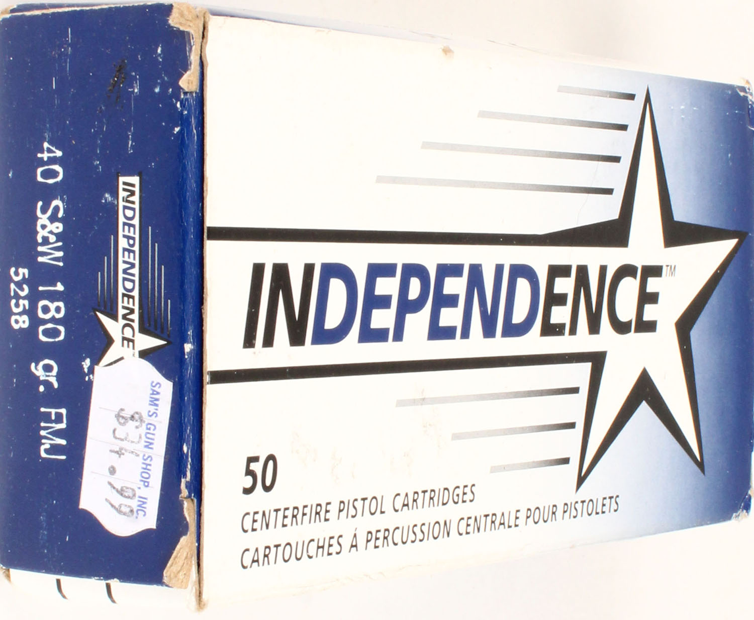 Independence, .40 S&W, 180 gr. FMJ, Full, 1pc. multi-colored box, box is solid, Ammo is excellent. Grade: Excellent - Value: 20 to 80