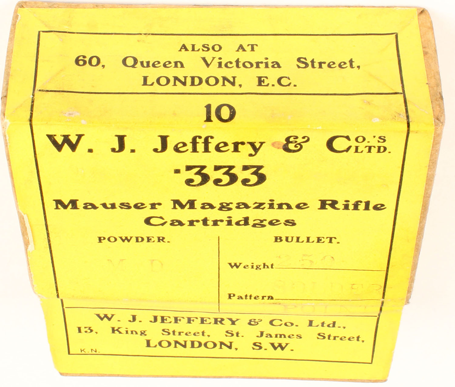 W.J. Jeffery & Co., .333 Mauser, Full & Sealed., 2pc. Buff box with yellow top & side sealing labels, box is solid, labels have great color. Grade: Excellent - Value: 30 to 90