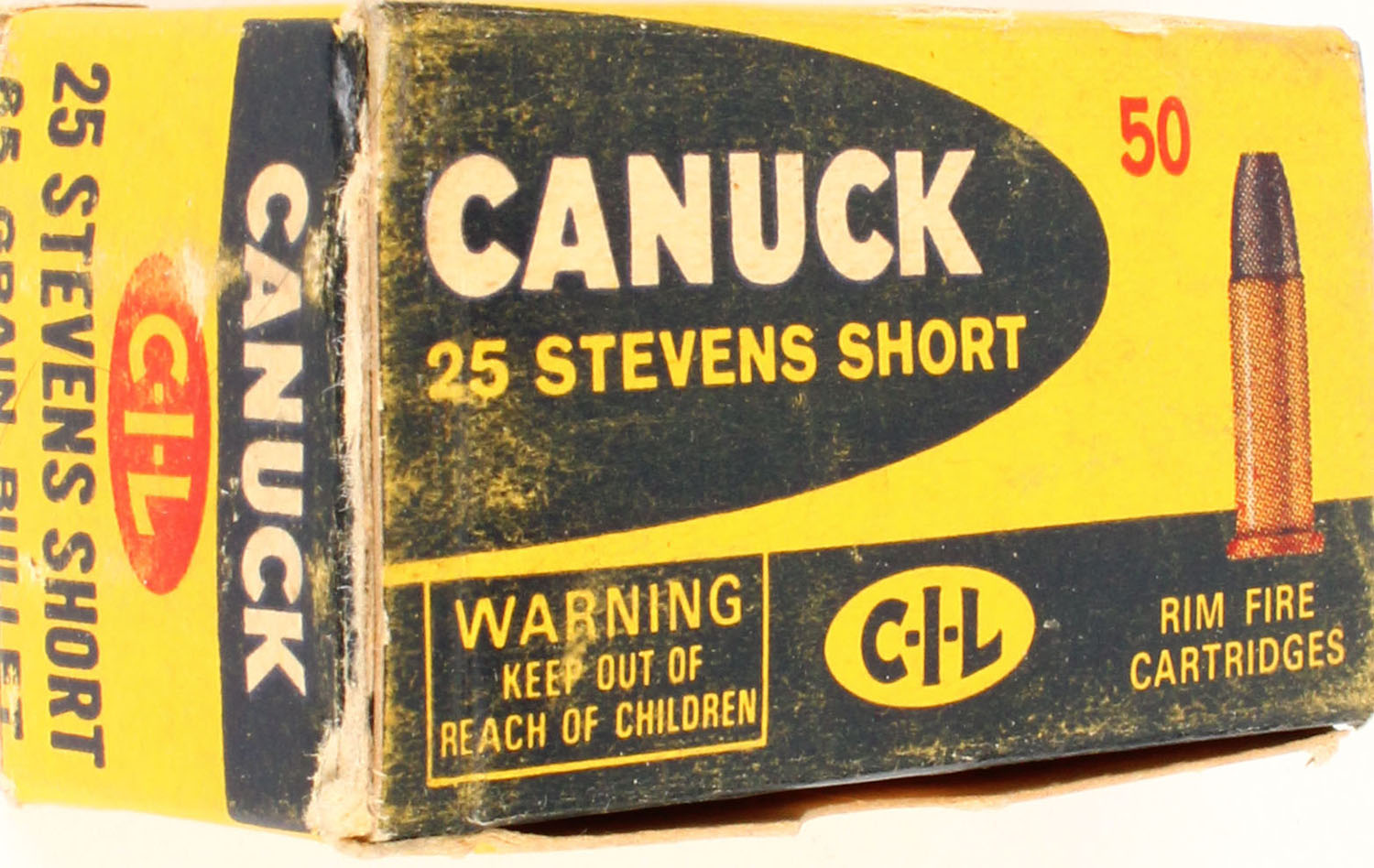 CIL, Canuck, 25 Stevens Short, 65 Grain, Full, 1pc. Multi-colored box, box has scuffing, Ammo is very good. Grade: Very Good + - Value: 50 to 150