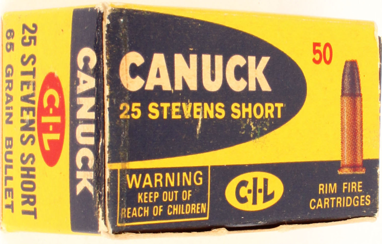 CIL, Canuck, 25 Stevens Short, 65 Grain, Full, 1pc. Multi-colored box, box has scuffing, Ammo is very good. Grade: Excellent - Value: 50 to 150