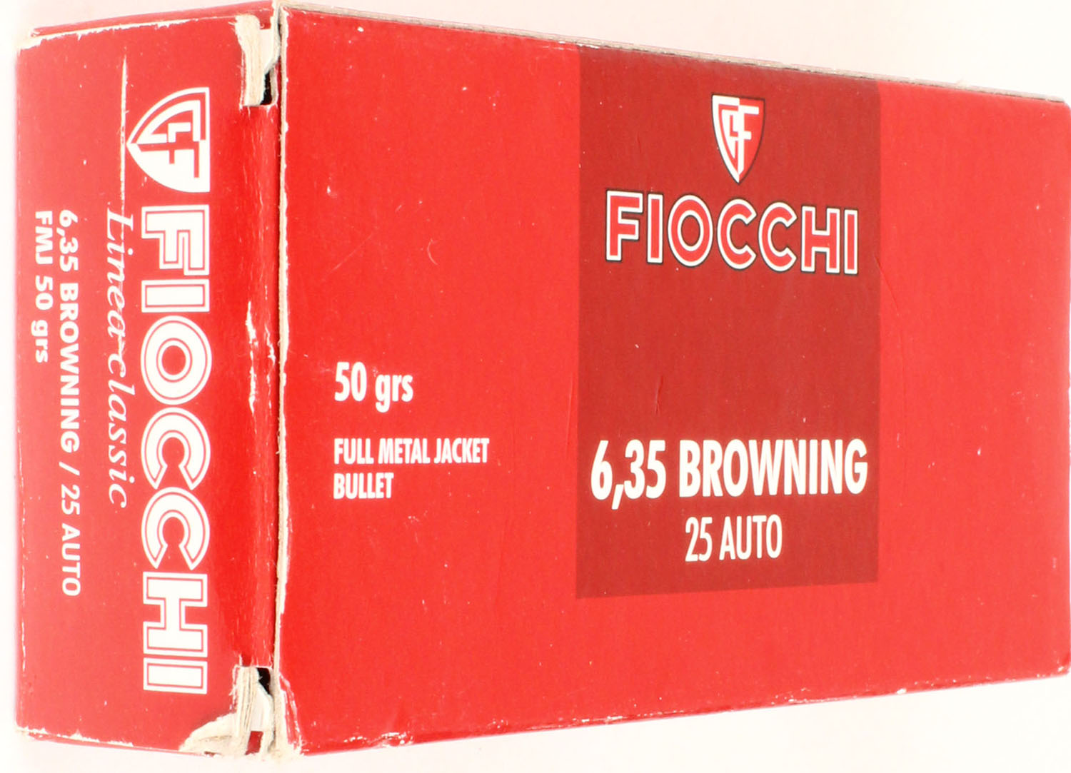 Fiocchi, .6.35 Browning(.25 Auto), 50 Grain FMJ, Full, 1pc. Multi-colored box, box is solid, has excellent color, Ammo is excellent. Grade: Excellent ++ - Value: 16 to 50