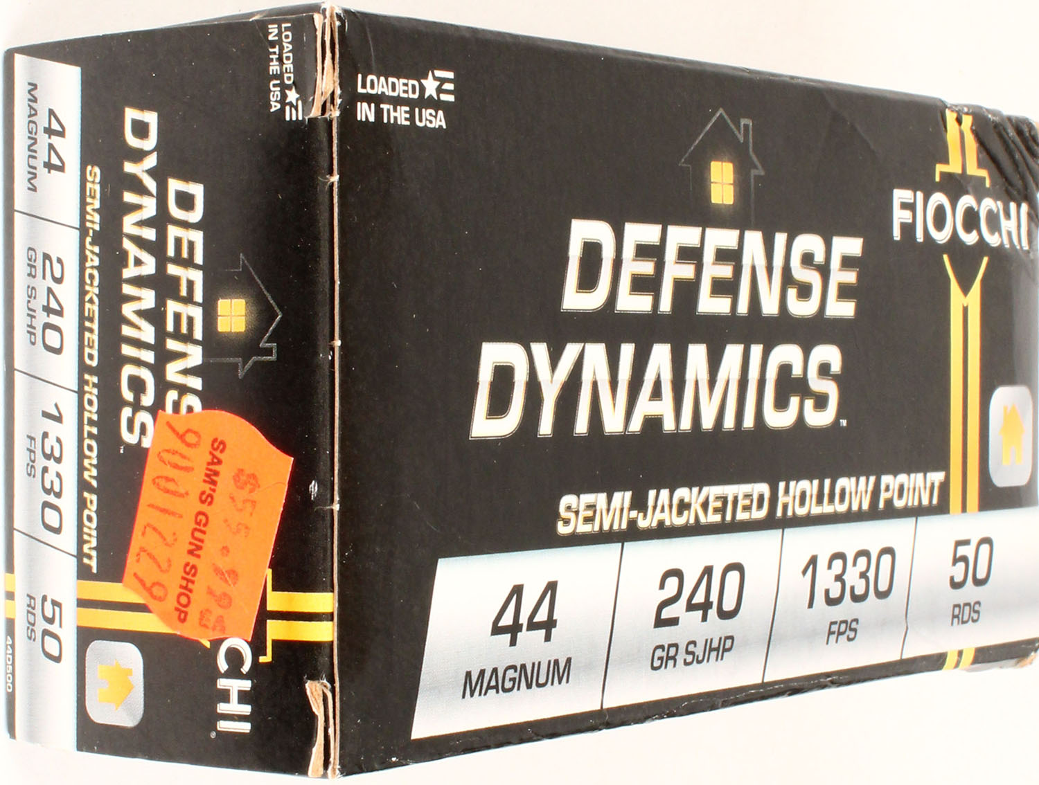 Fiocchi, 44 Mag., 240 Grain SJHP, Full, 1pc. Multi-colored box, box has scuffing, has excellent color, Ammo is excellent. Grade: Excellent - Value: 20 to 80