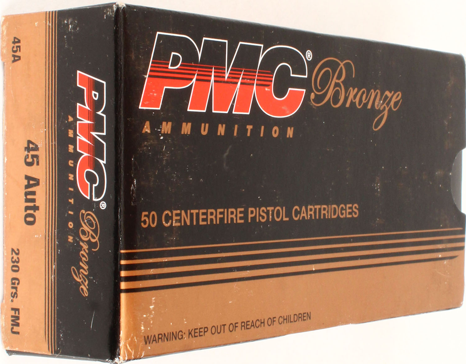 PMC, Bronze, .45 auto, 230 gr. FMJ, Full, 1pc. multi-colored box, box is solid, with excellent color, Ammo is excellent. Grade: Excellent ++ - Value: 16 to 60