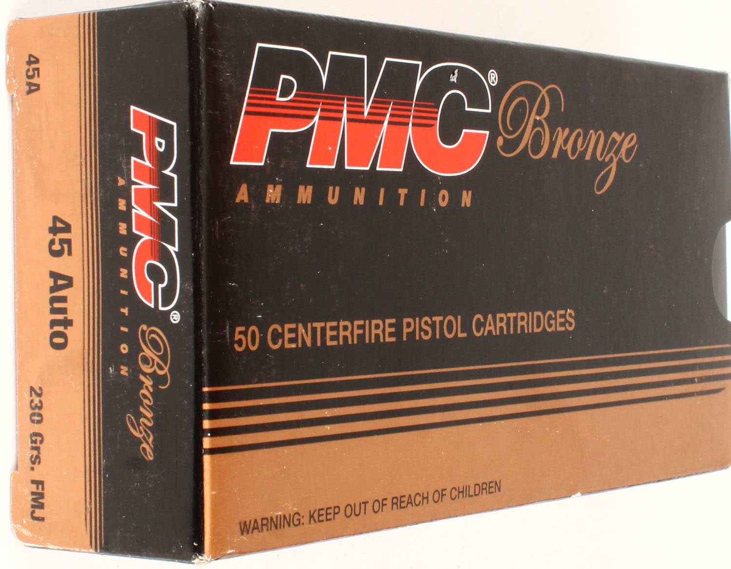PMC, Bronze, .45 auto, 230 gr. FMJ, Full, 1pc. multi-colored box, box is solid, with excellent color, Ammo is excellent. Grade: Excellent ++ - Value: 16 to 60