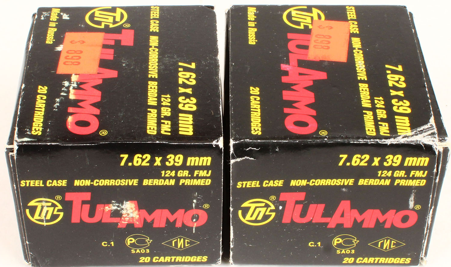 Lot of 2 TulAmmo, 7.62x39mm, 124 Grain FMJ, Full, 1pc. Multi-colored box, box is solid, with excellent color, Ammo is excellent. Grade: Excellent - Value: 20 to 60