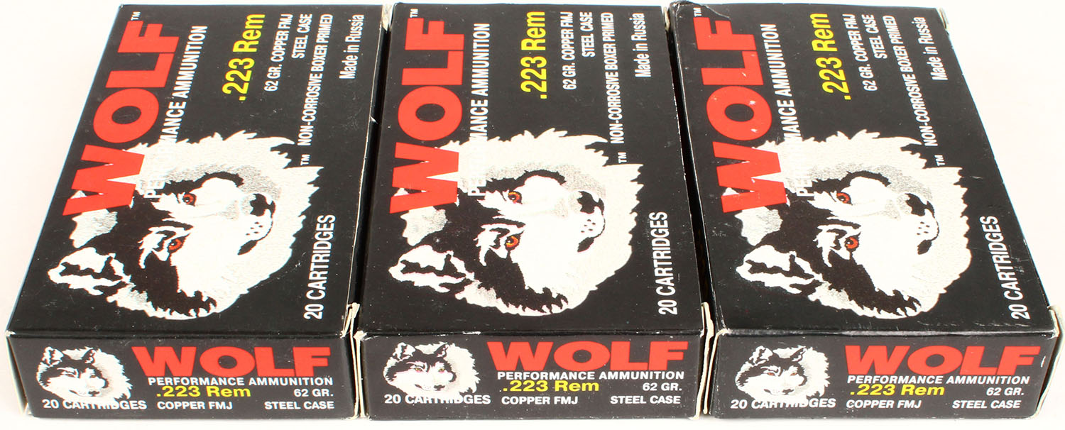 Lot of 3 Wolf, 223 Rem, 62 Grain Copper FMJ, Full, 1pc. Multi-colored box, box is solid, with excellent color, Ammo is excellent. Grade: Excellent - Value: 20 to 60