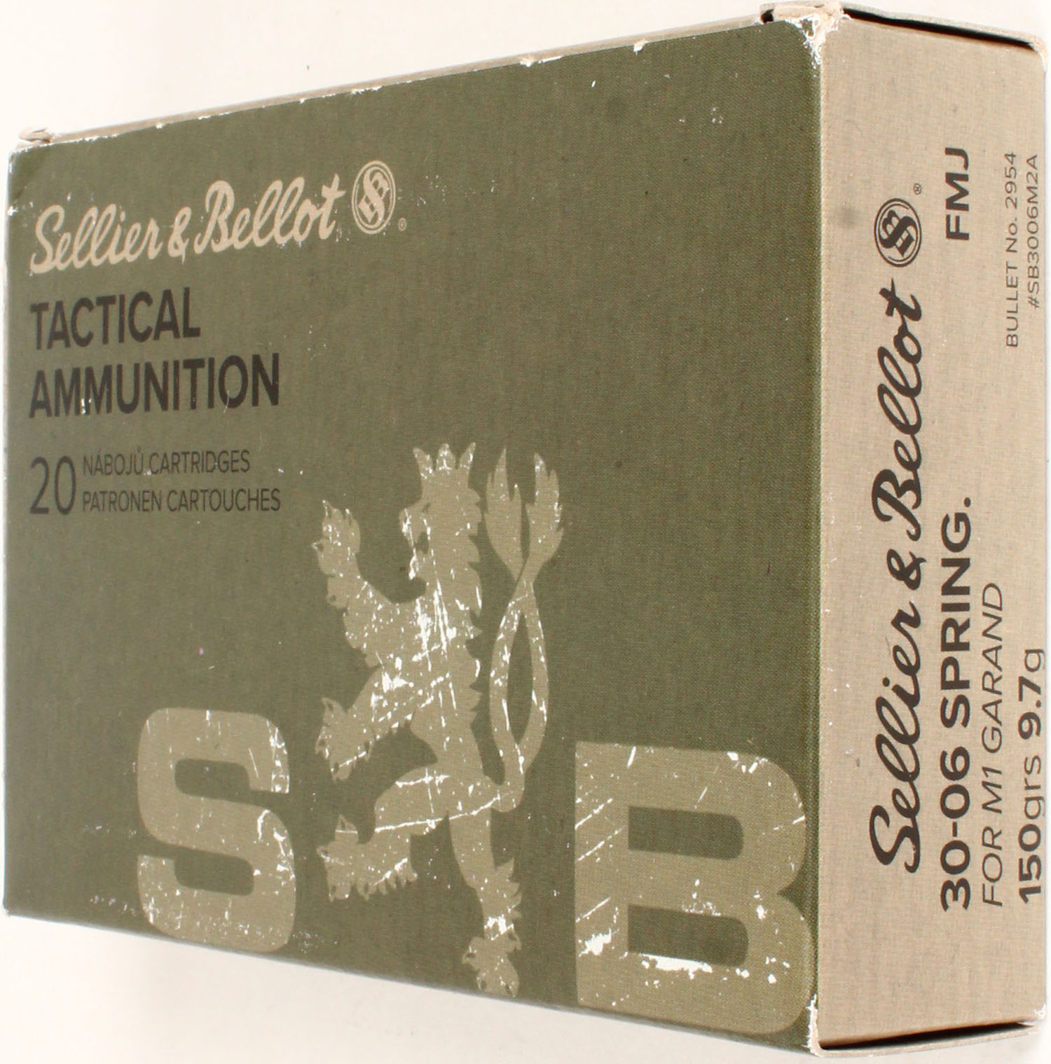 Sellier & Bellot, 30-06 SPRG, 150 Grs. FMJ, Full, 1pc. Multi-colored box, box is solid, with excellent color, labeled ''for M1 Garand'' Ammo is excellent. Grade: Excellent - Value: 20 to 60