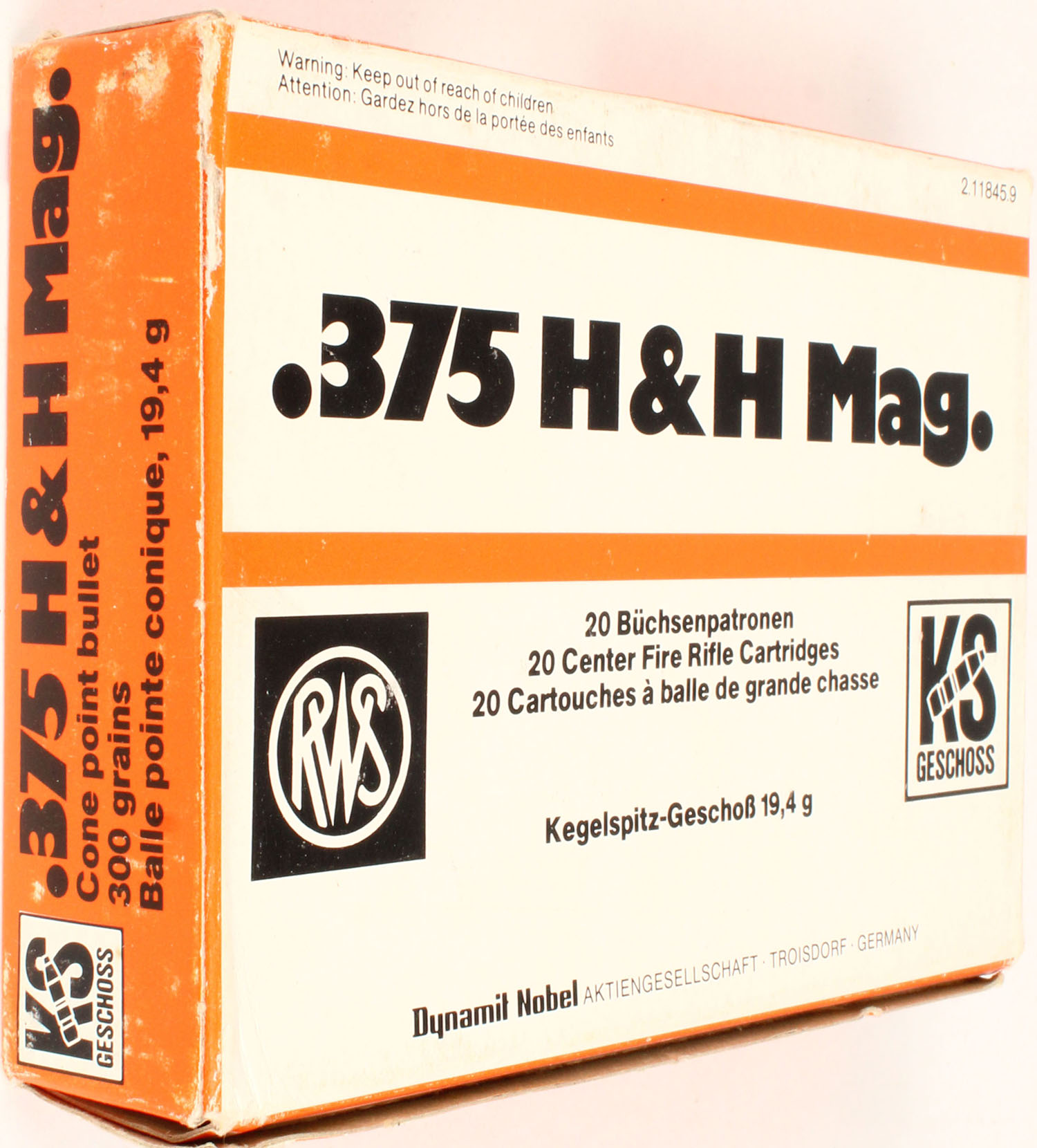 RWS, 375 H&H Mag, 300 Grs. Cone Point Bullet, Full, 1pc. Multi-colored box, box is solid, with excellent color, Ammo is excellent. Grade: Excellent - Value: 20 to 60
