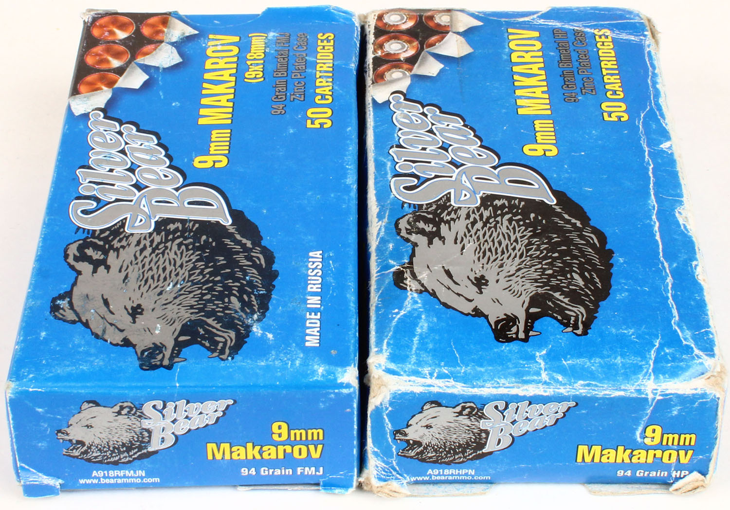 Lot of 2 Silver Bear, 9mm Makarov, 94 Grs. FMJ/HP, Full, 1pc. Multi-colored box, box is solid, with excellent color, Ammo is excellent. Grade: Excellent - Value: 20 to 60