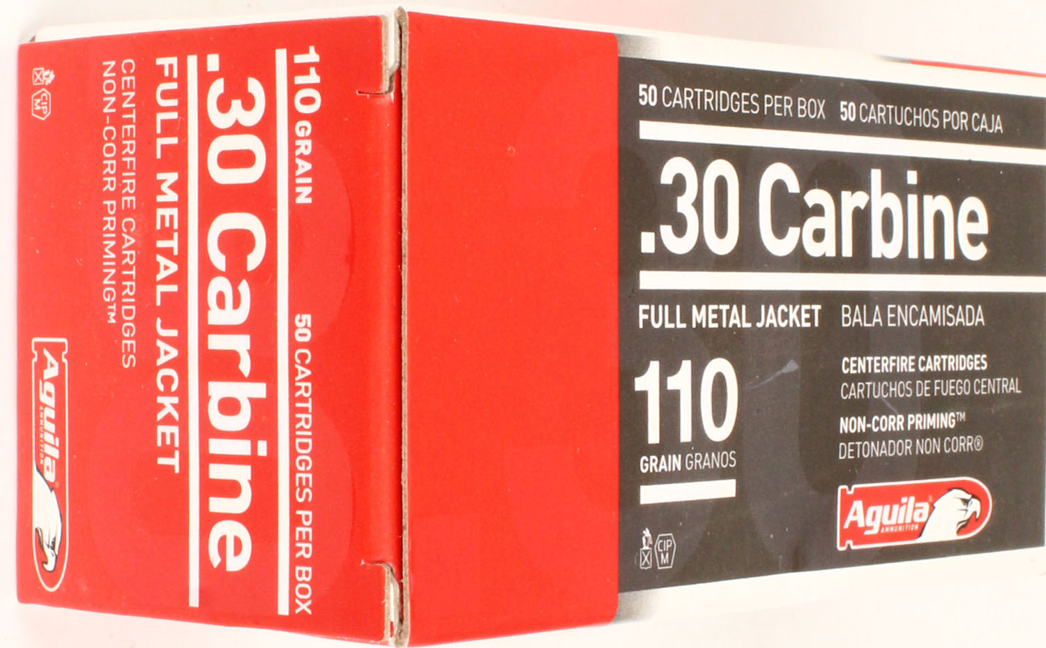Aguila, 30 Carbine, 110 Grs. FMJ, Full, 1pc. Multi-colored box, box is solid, with excellent color, Ammo is excellent. Grade: Excellent - Value: 20 to 60