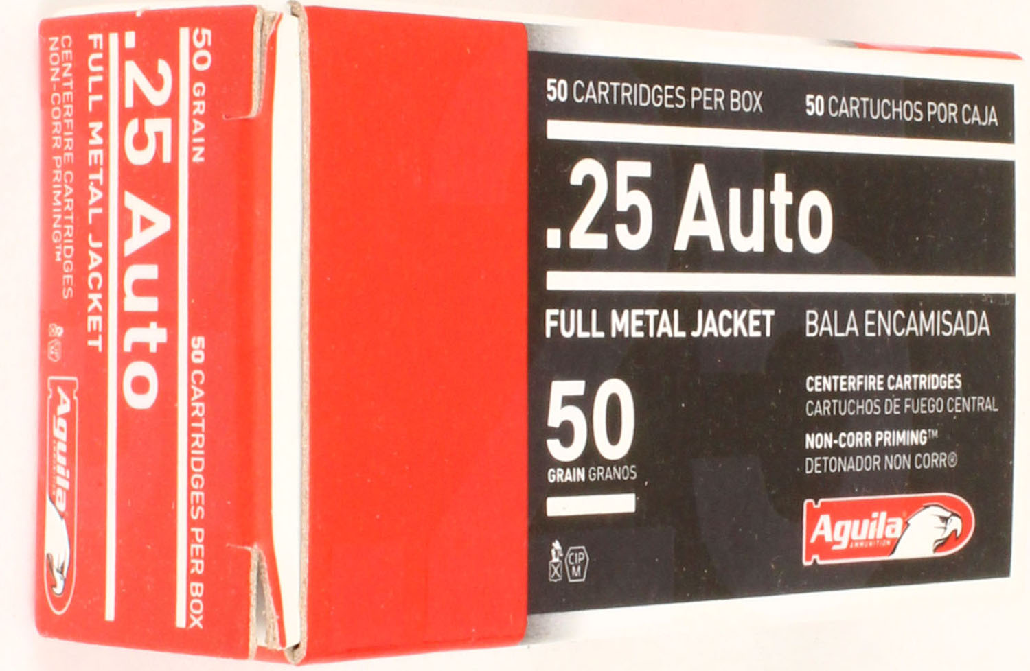 Aguila, 25 Auto, 50 Grs. FMJ, Full, 1pc. Multi-colored box, box is solid, with excellent color, Ammo is excellent. Grade: Excellent - Value: 20 to 60