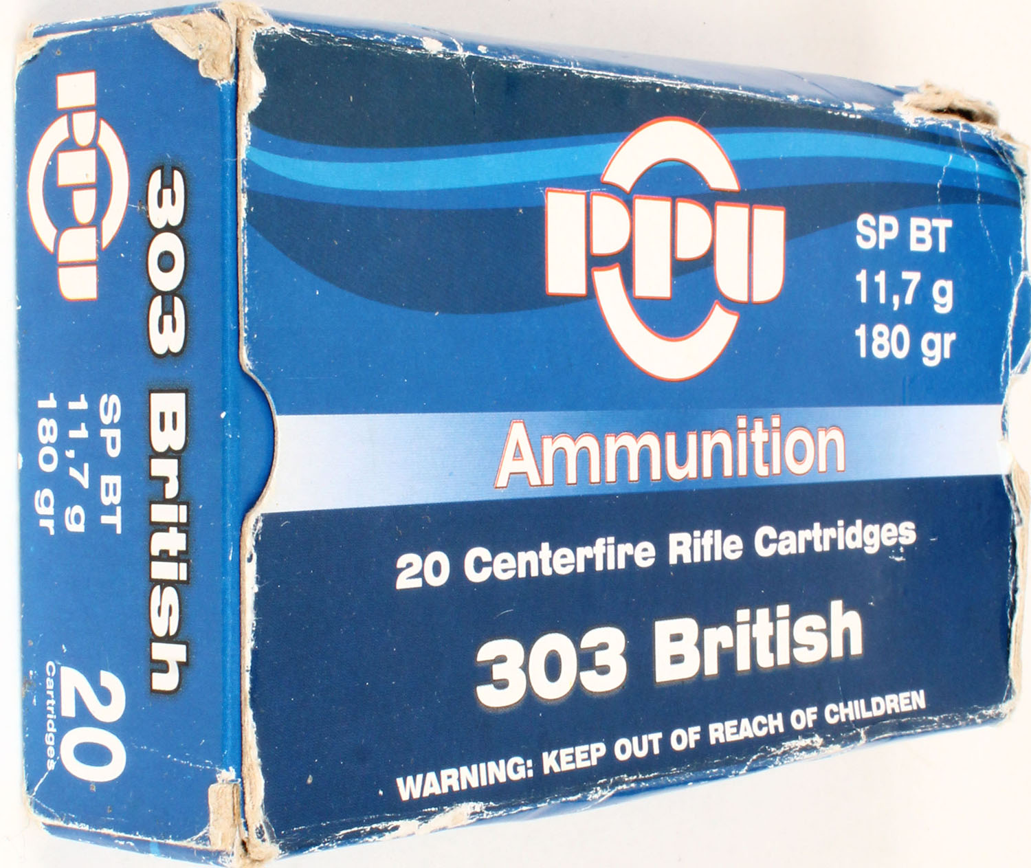 PPU, 303 British, 180 Grs. SP BT, Full with 5rds. being FMJ, 1pc. Multi-colored box, box is solid, with excellent color, Ammo is excellent. Grade: Excellent - Value: 20 to 60
