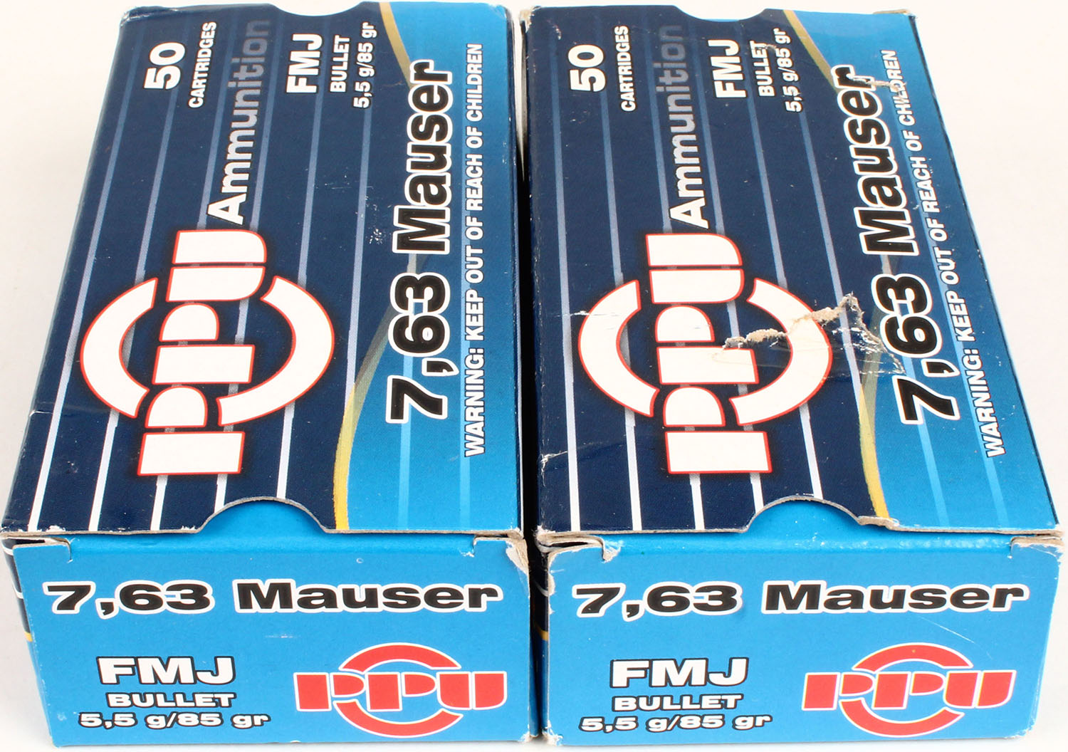 Lot of 2 PPU, 7.63 Mauser, 85 Grs. FMJ, Full, 1pc. Multi-colored box, box is solid, with excellent color, Ammo is excellent. Grade: Excellent - Value: 20 to 60