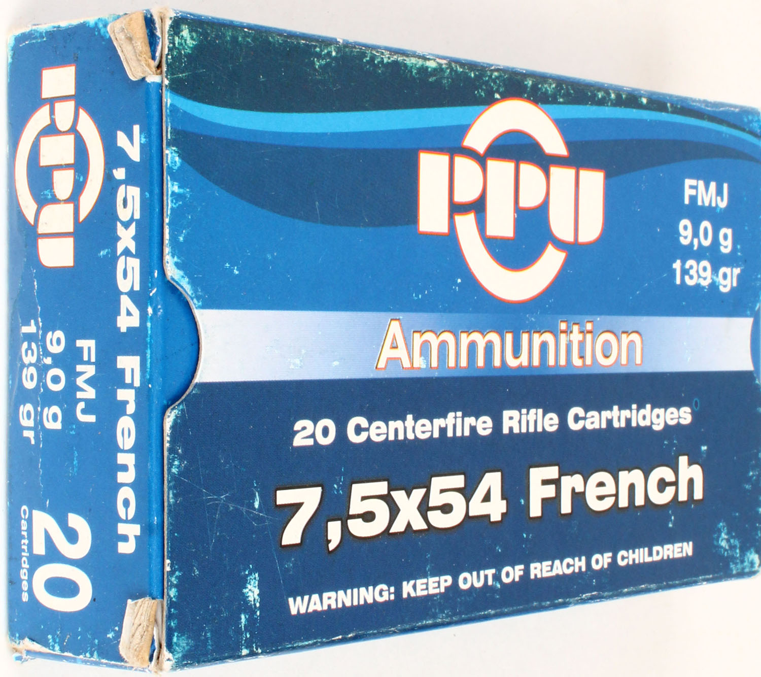 PPU, 7.5x54 French, 139 Grs. FMJ, Full, 1pc. Multi-colored box, box is solid, with excellent color, Ammo is excellent. Grade: Excellent - Value: 20 to 60