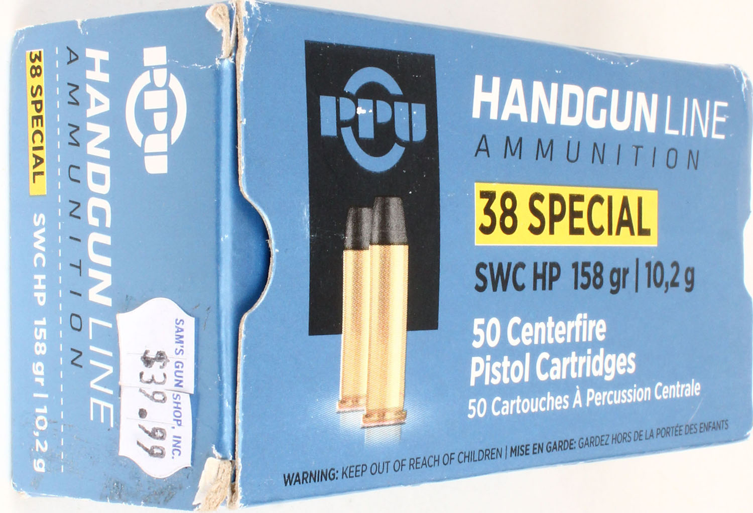 PPU, 38 Special, 158 Grs. SWC HP, Full, 1pc. Multi-colored box, box is solid, with excellent color, Ammo is excellent. Grade: Excellent - Value: 20 to 60