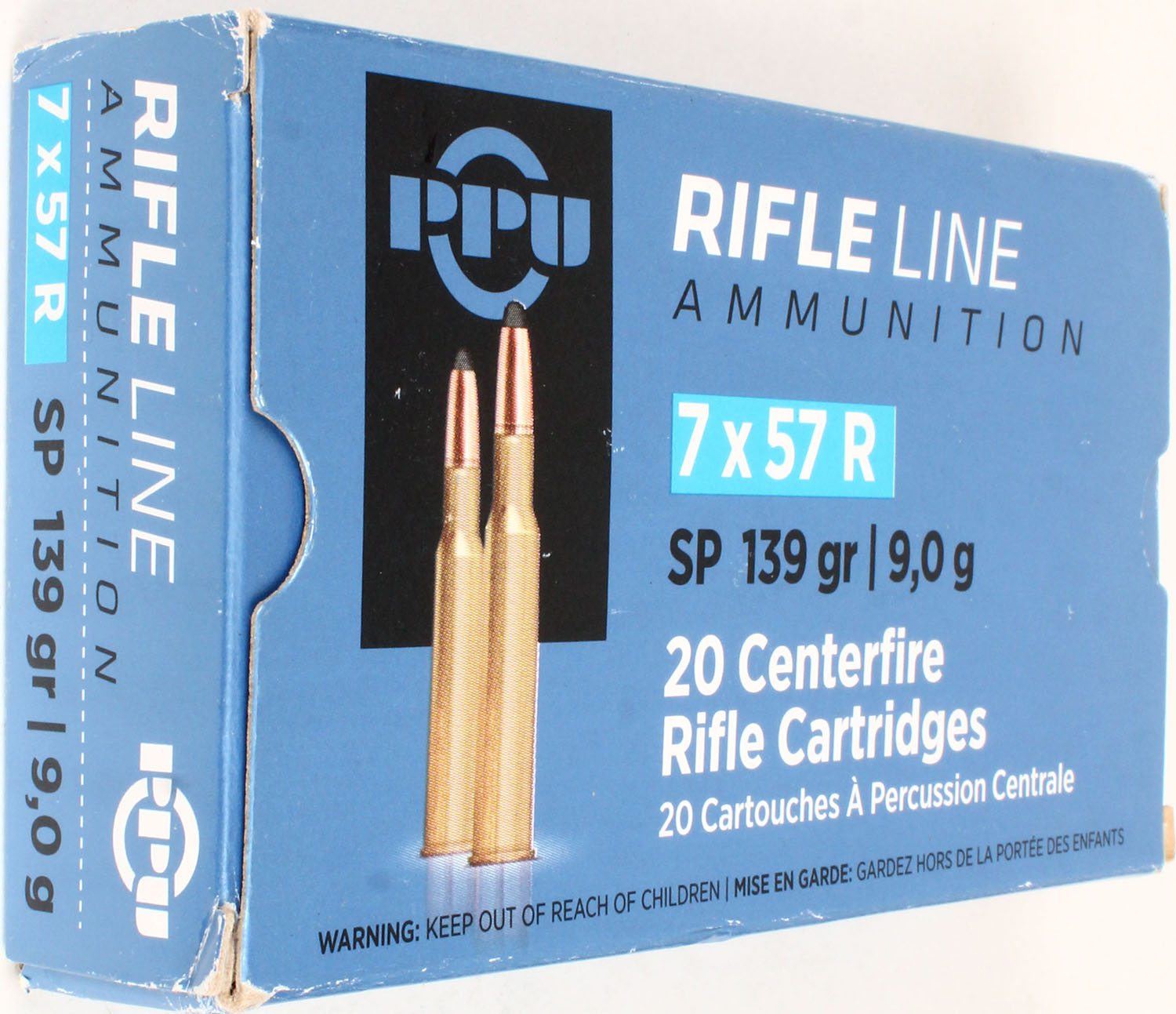 PPU, 7x57 R, 139 Grs. SP, Full, 1pc. Multi-colored box, box is solid, with excellent color, Ammo is excellent. Grade: Excellent - Value: 20 to 60