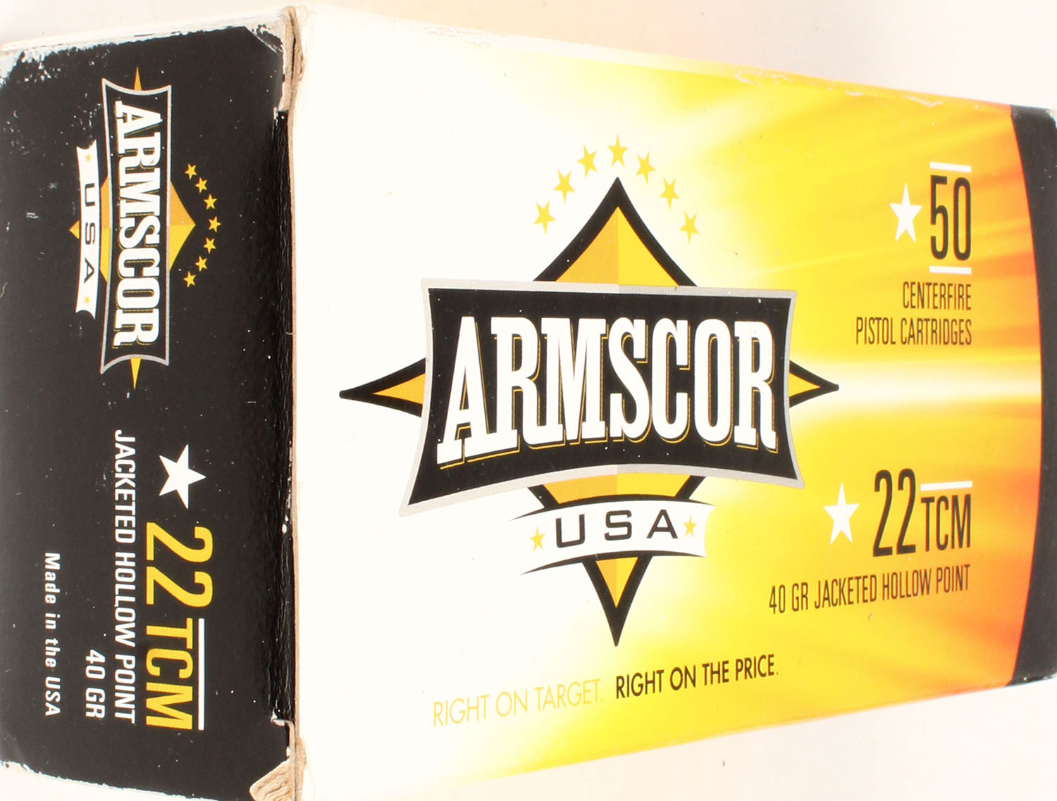 Armscor, 22 TCM, 40 Grain JHP, Full, 1pc., Multi-colored box, box is solid with great color, Ammo is excellent. Grade: MINT - Value: 10 to 60