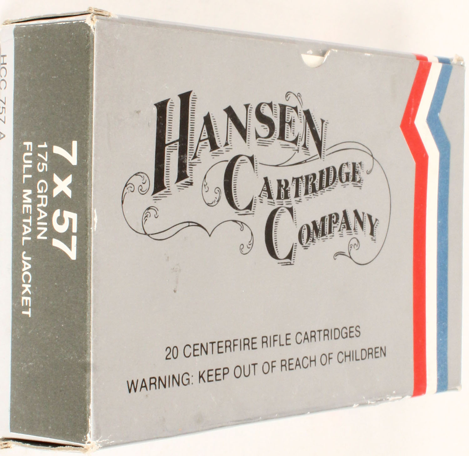 Hansen Cart. Co., 7x57, 1pc., Full, silver, red, white & blue box, box & ammo are near mint. Grade: Excellent ++ - Value: 10 to 50