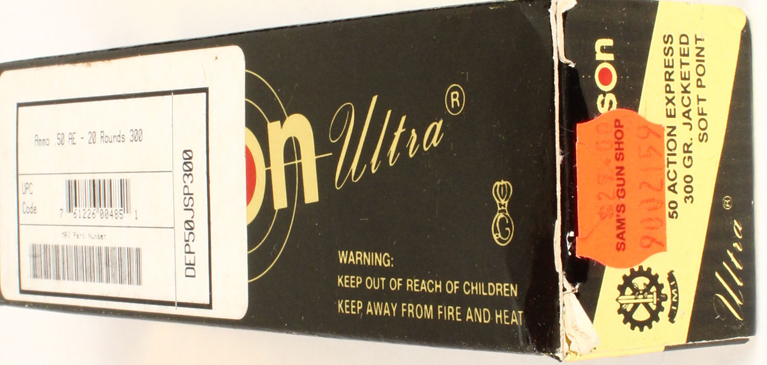 Samson, .50 Auction Express, 300 Grain JSP, Full, 1pc., Multi-colored box, box is solid with great color, ammo is excellent. Grade: Excellent ++ - Value: 20 to 60