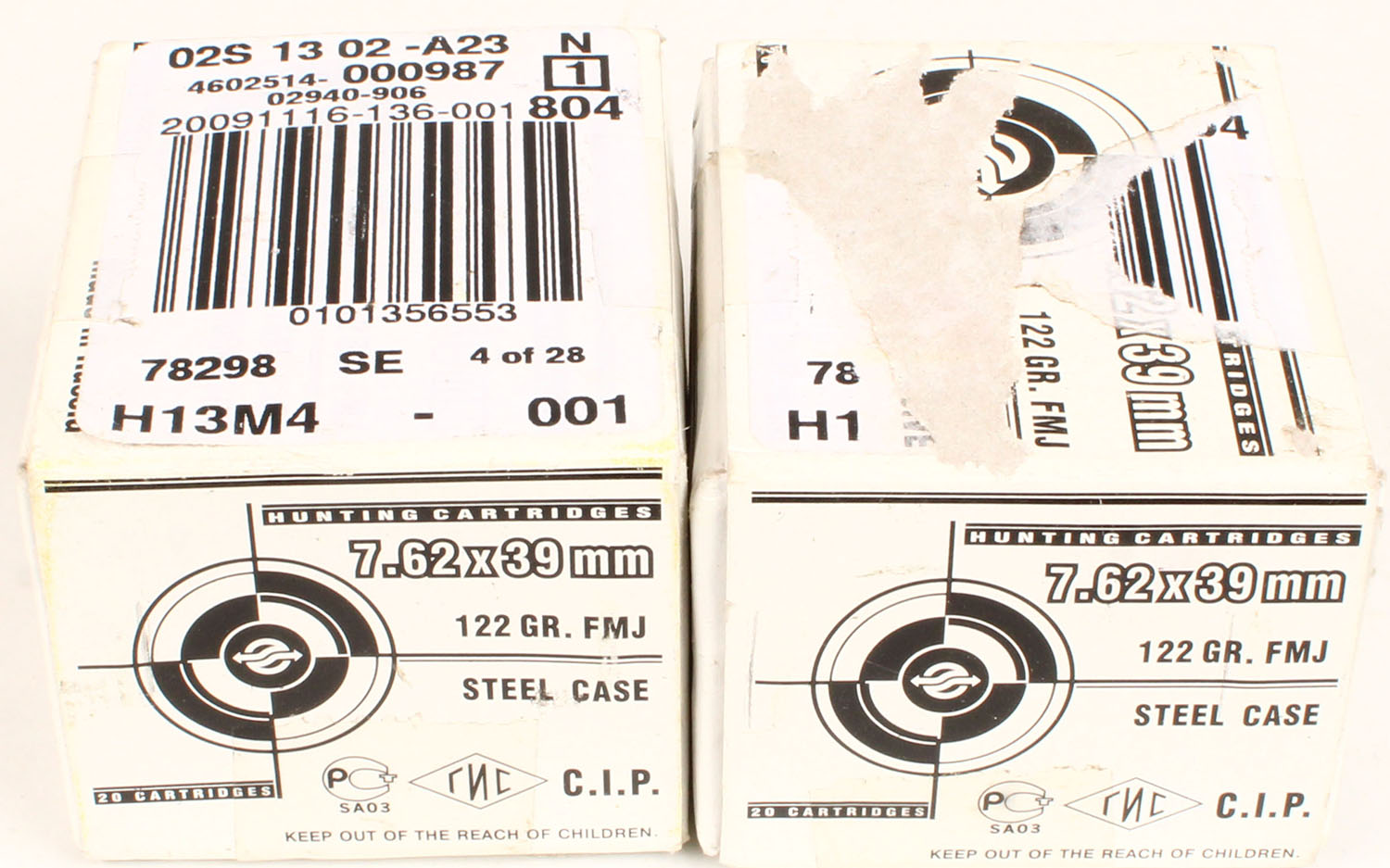 Lot of 2 Open-End Jointed Stock Co., 7.62x39mm, 122gr., 1pc., Full, boxes & ammo are excellent. Grade: Excellent - Value: 10 to 60