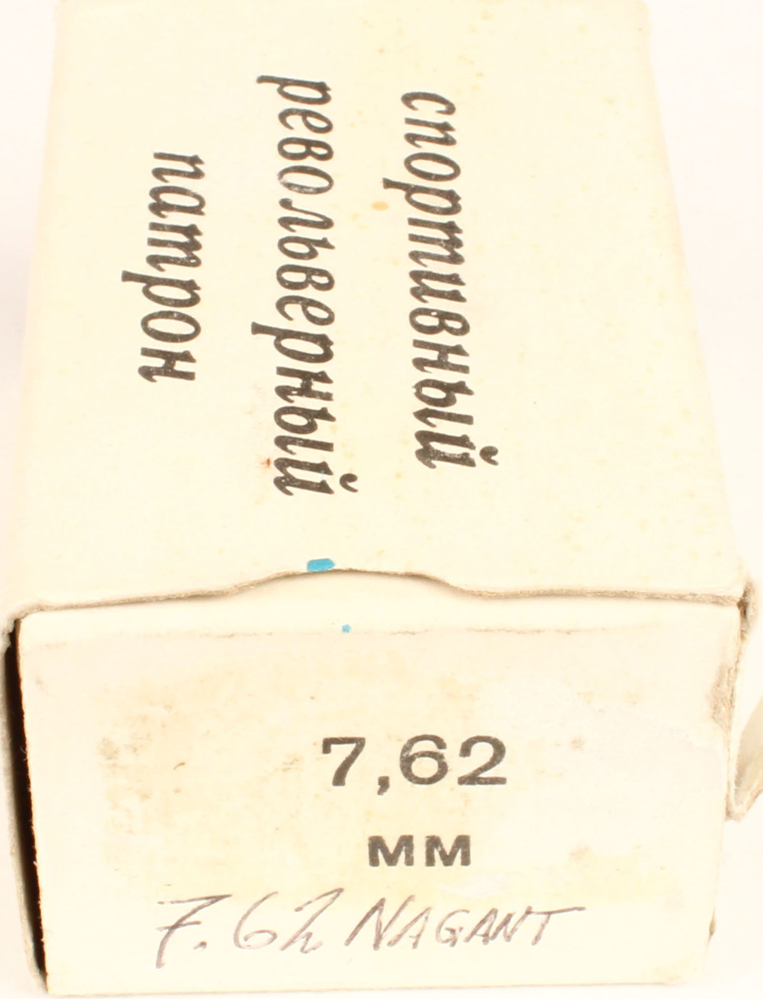 Russian Ammo, 7.62 Nagant, Unknown Grain, Full, 1pc. Black & white box, box is solid, but has light soiling with very nice color, Ammo is excellent. Grade: Excellent - Value: 20 to 60