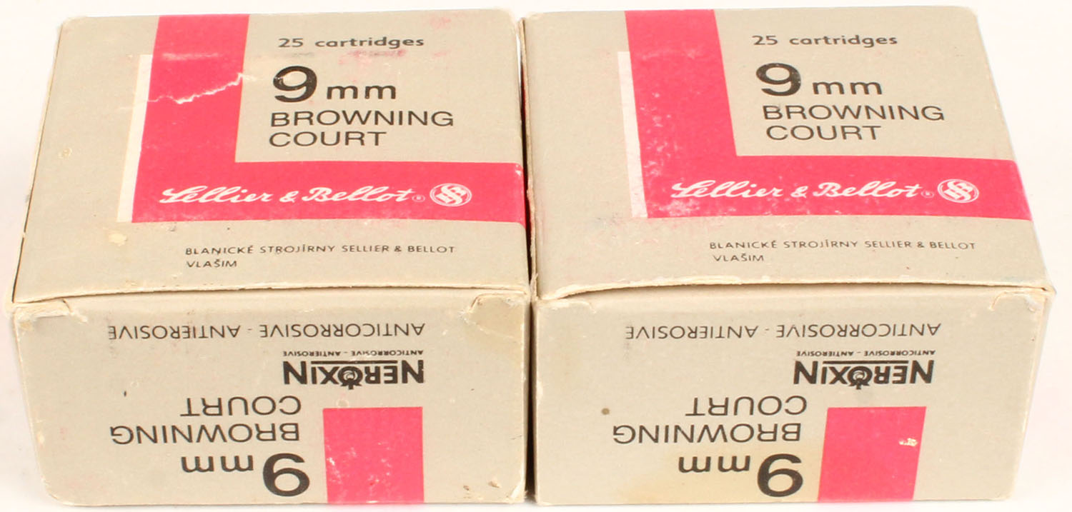 Lot of 2 Sellier & Bellot 9mm Browning Court, 1pc, Full, boxes & ammo are excellent. Grade: Excellent - Value: 16 to 50