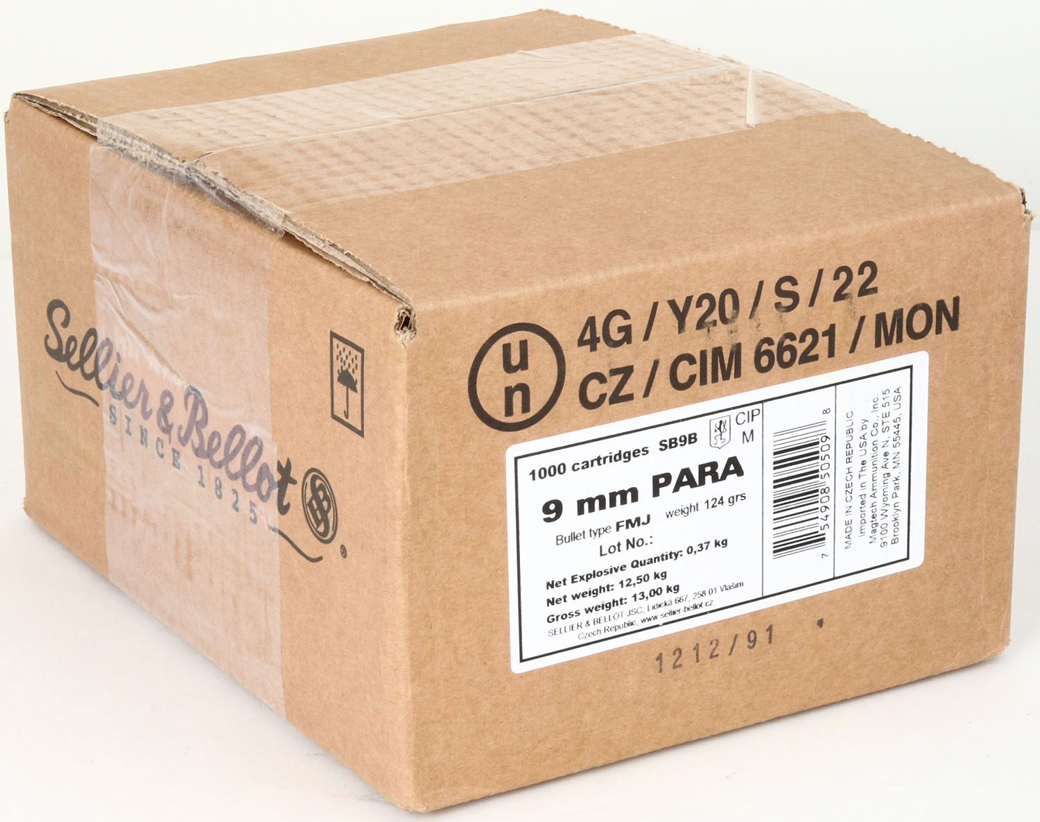 Sellier & Bellot 1000 rd case of 9mm Para, FMJ, 124 grs. Grade: MINT - Value: 250 to 500