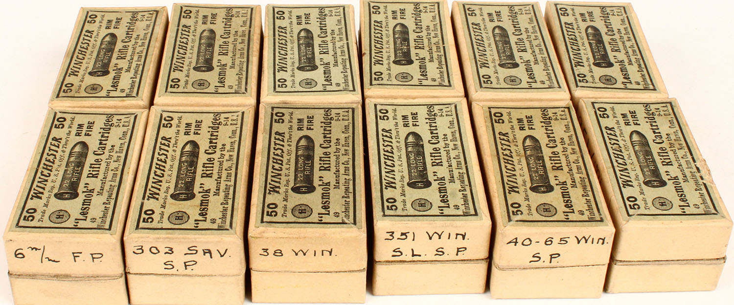 Lot of 12 .22 cal. boxes, 2pc, Empty, multi-colored boxes. Grade: Very Good ++ - Value: 2 to 40