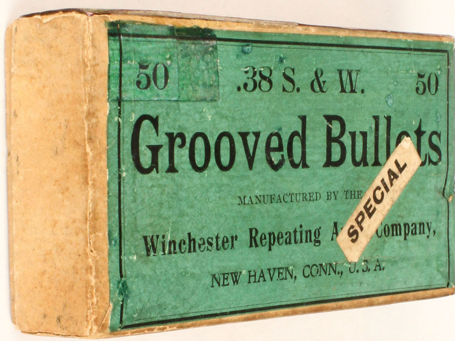 Winchester, .38 S&W, Grooved Bullets, Full, 2pc. Buff box with green label, box is solid with very nice color, light age soiling & tape repair, bullets are very good. Grade: Excellent - Value: 20 to 60