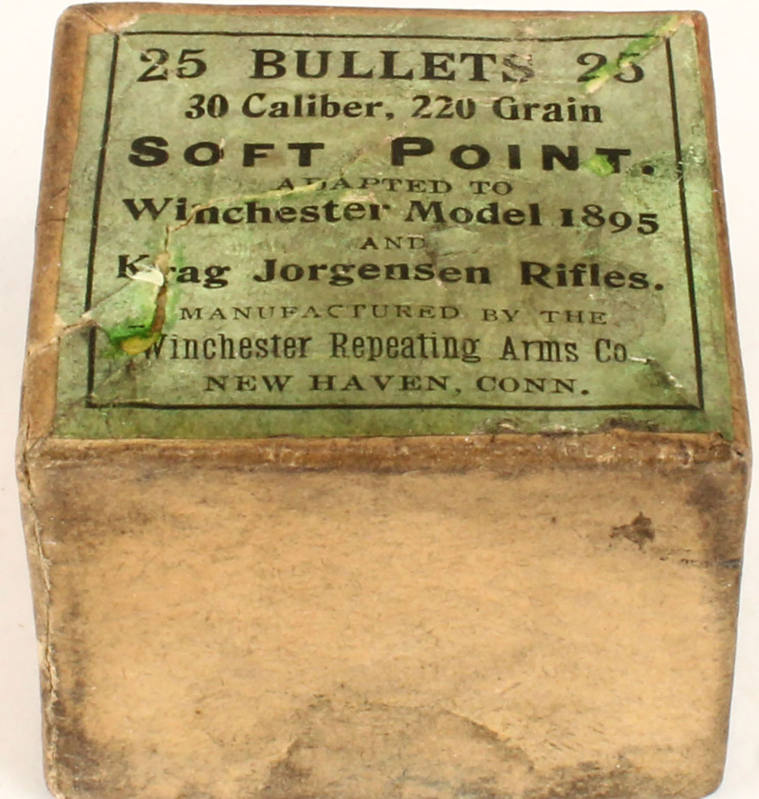 Winchester, .30 Cal. 220 Grs. Soft Point, Partial 24rds., 2pc. Buff box with green label, box has hole in bottom of box with nice color, age soiling, bullets are very good. Grade: Very Good ++ - Value: 10 to 40