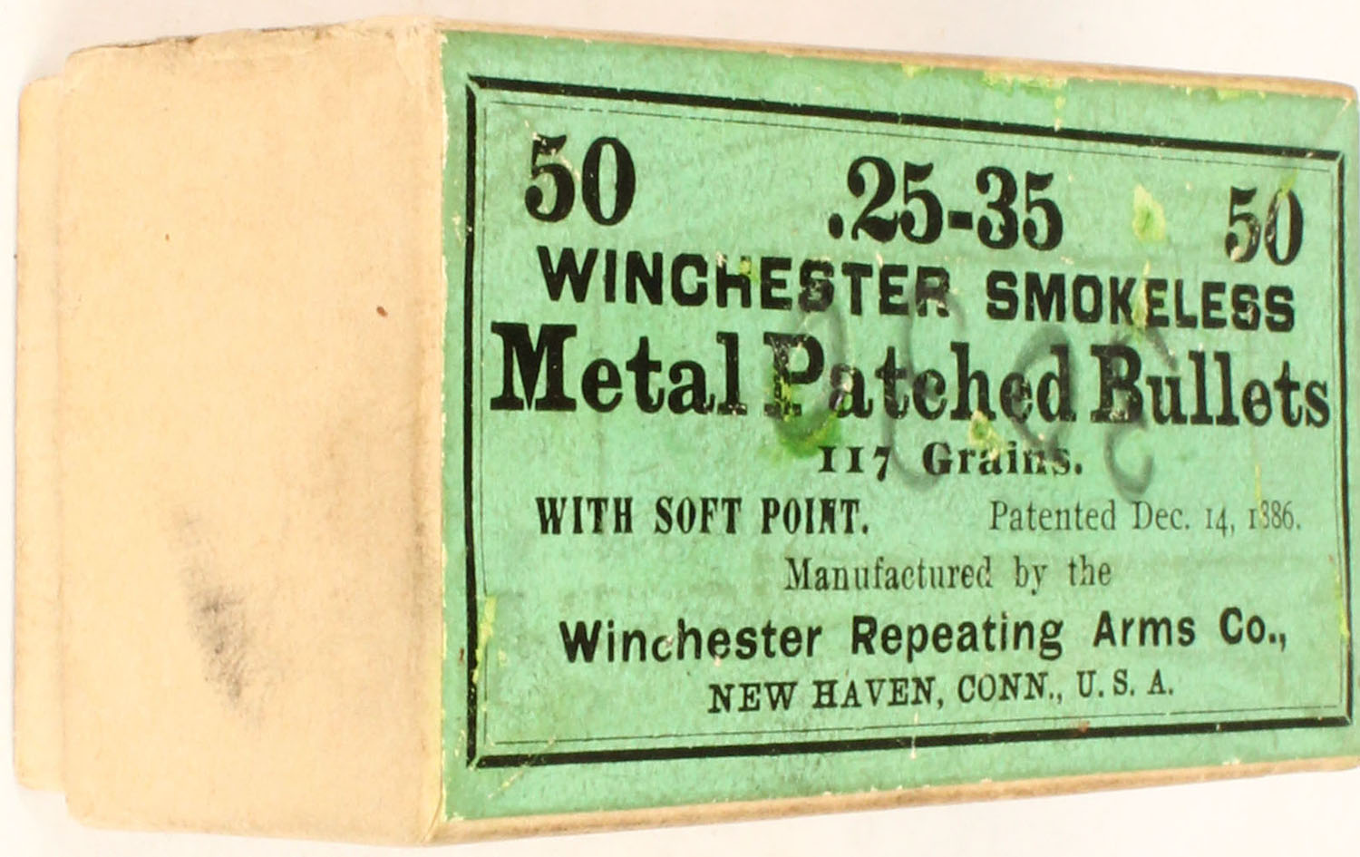 Winchester, .25-35 Cal. 117 Grs. Metal Patch Soft Point Bullets, Full, 2pc. Buff box with green label, box is very solid with great colors, bullets are excellent. Grade: Excellent + - Value: 20 to 60