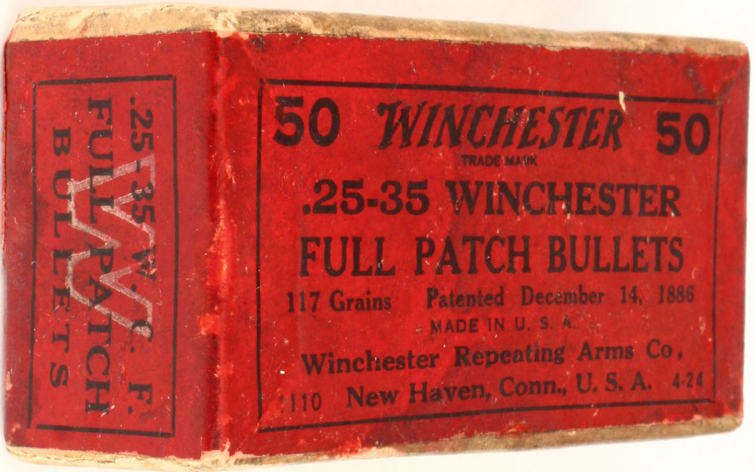 Winchester, .25-35 Cal., 117 Grs. Full Patched Bullets, Full, 2pc. Buff box with red label, box has tape repair, soiling & scuffing, with great colors, Bullets are excellent. Grade: Excellent - Value: 20 to 60